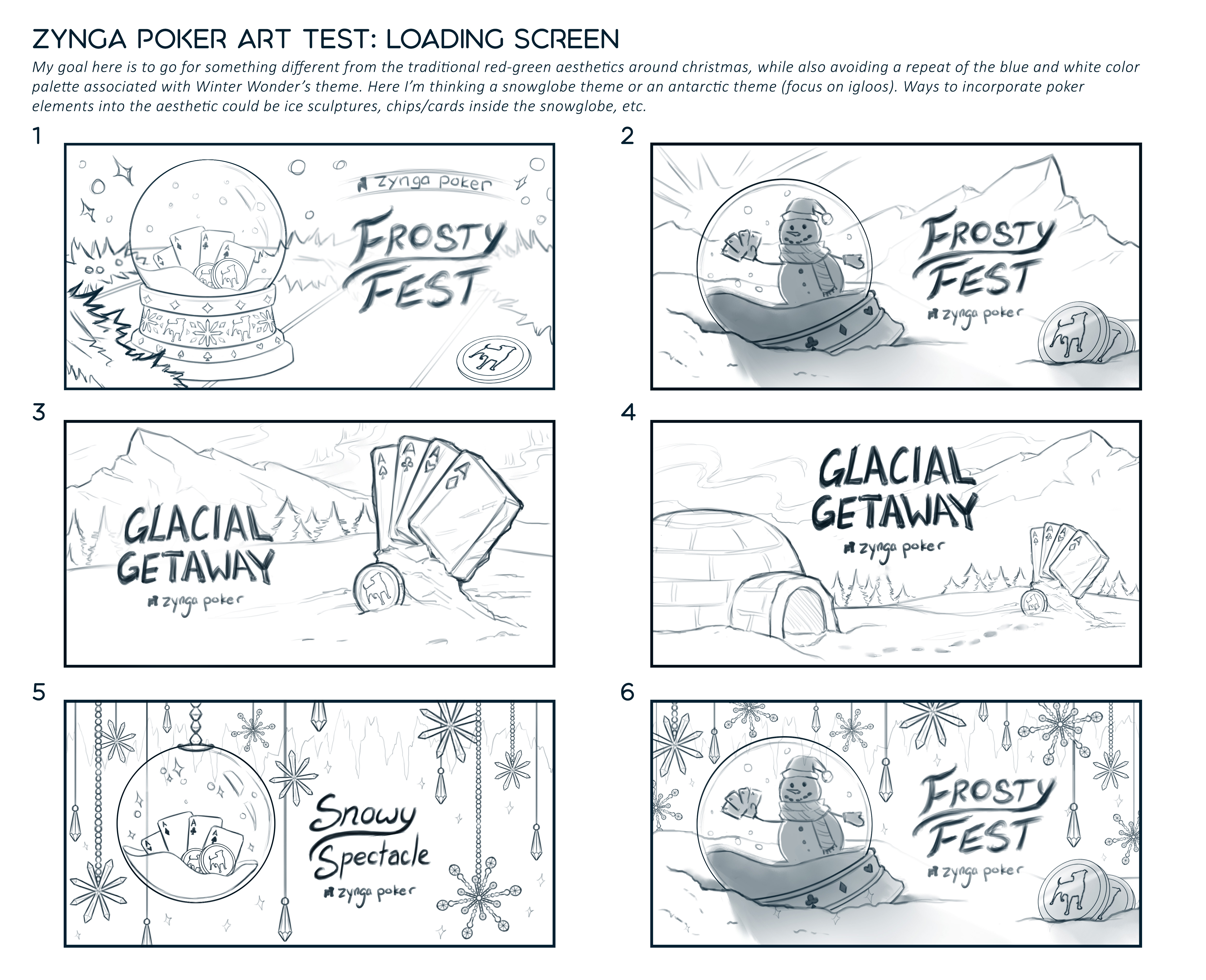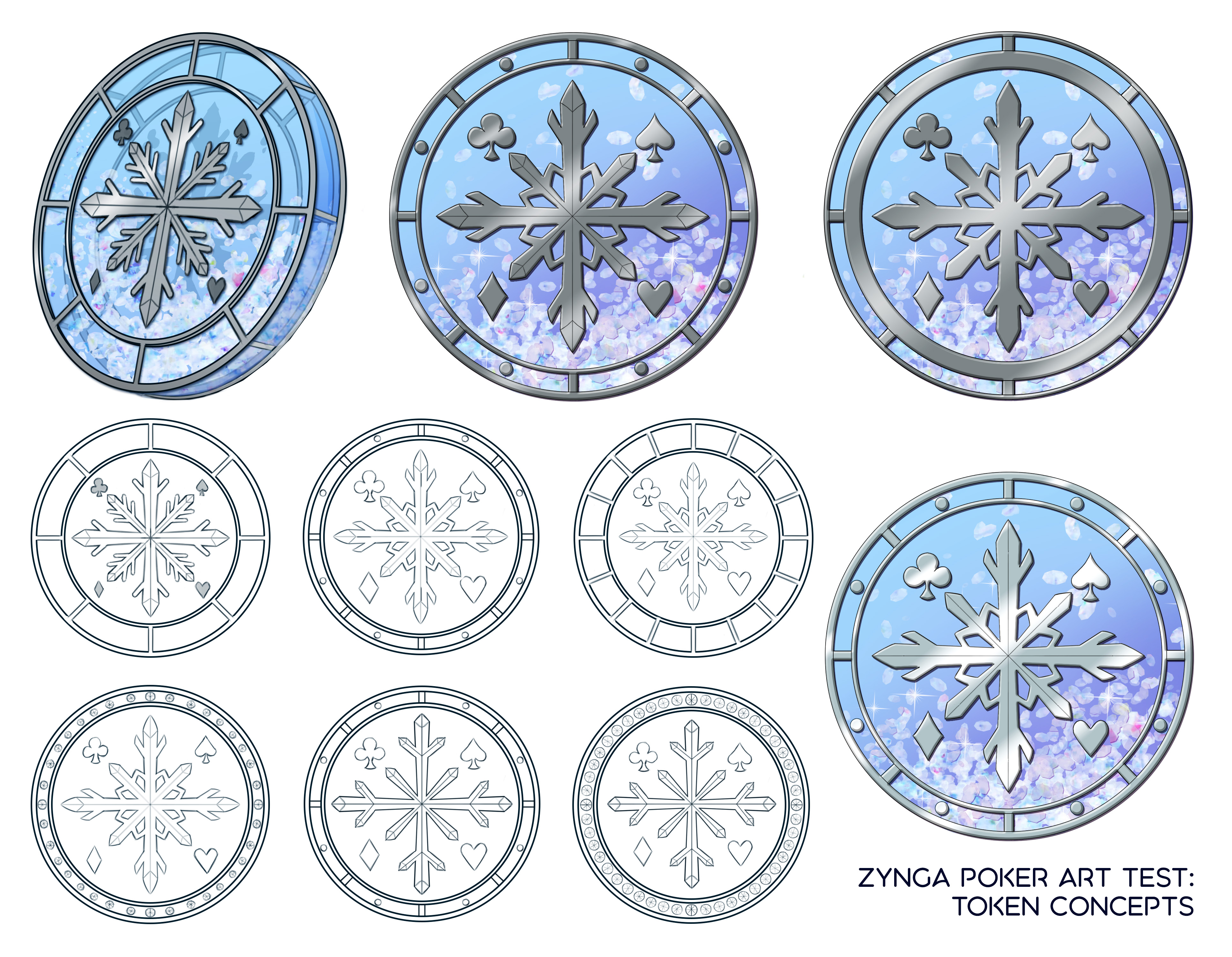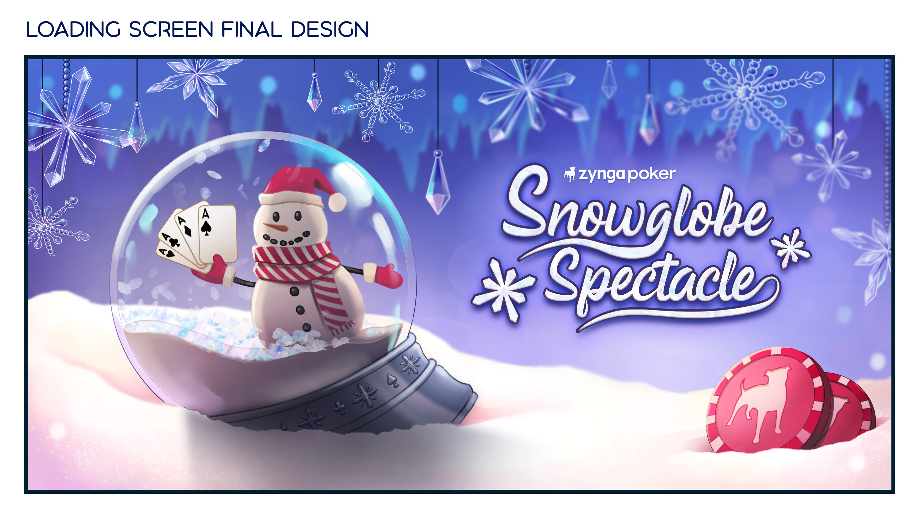 The following was an art test for a Zynga Poker game event. The assignment was to create a winter-themed event, and then design a poker chip and a loading screen to match. Both the poker chip and loading screen were designed to be translated into 3D. The theme that I chose was a snowglobe-centric aesthetic.