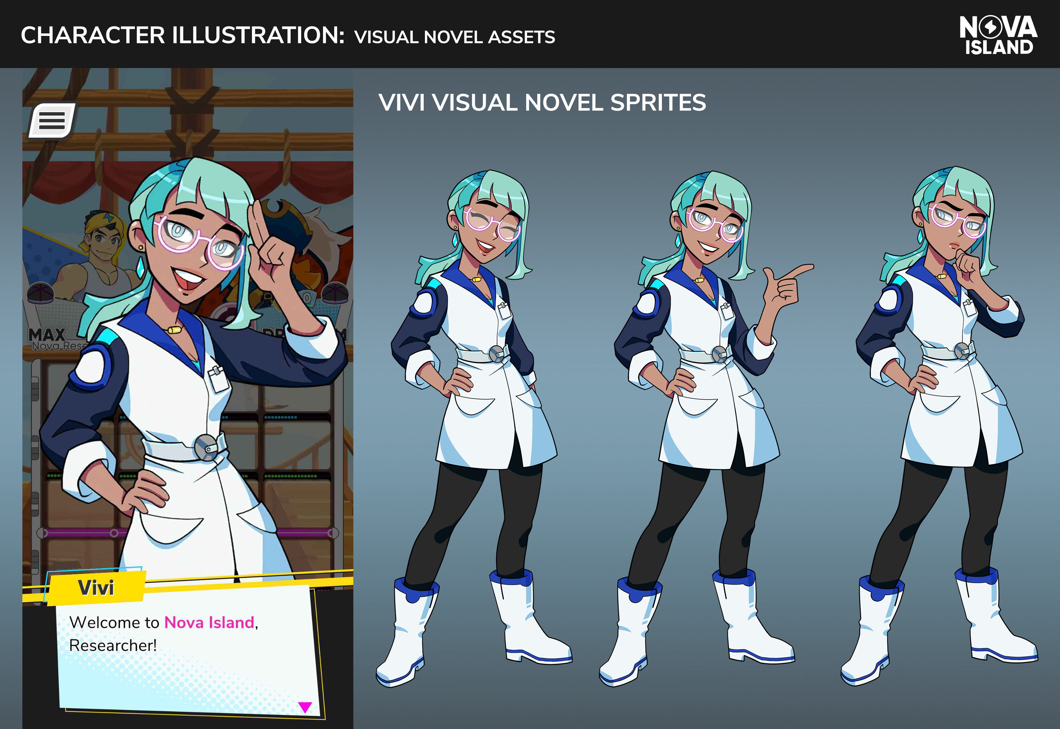 A variety of character sprites for the visual novel portion of the mobile game Nova Island